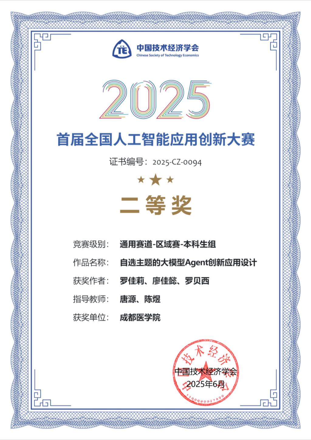 参赛队团队唐燕茜、熊慧、黄立奇组(指导教师唐源、陈煜),罗佳莉、廖佳懿和罗贝西组(指导教师唐源、陈煜)均获得“自选主题的大模型Agent创新应用设计”省级二等奖。通过优异的参赛表现,学生团队获得了评委的高度评价,创新性地设计与应用大模型Agent,展示了人工智能在医学应用中的广泛潜力,为医学领域的智能化发展提供了新的思路与解决方案。充分体现了成都医学院学生的创新思维和实践能力,展示了学生对智能医学领域的深刻理解。